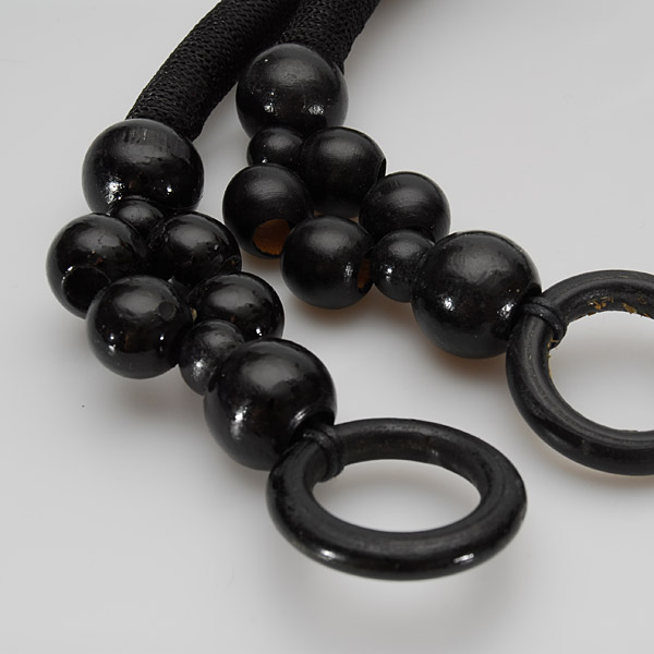 Ucha na tašky z dřevěných korálek v černé barvě. Ucha jsou složena z deseti korálek oválného tvaru, na obou koncích je kruh o vnějším průměru cca 5 cm a vnitřním průměru cca 3. Jsou spojeny voskovanou bavlněnou šňůrkou. Délka ucha bez kruhů je cca 30 cm, celková délka ucha je cca 15x40 cm.
