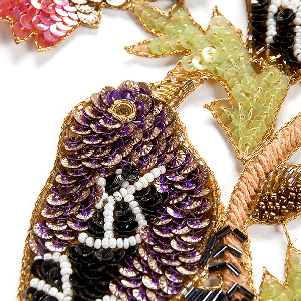Velikost :Korálková a flitrová aplikace dvou ptáčků je velká cca 21,5x14 cm, samotní ptáčci jsou velcí cca 10x4 cm mají flitry fialové,zlaté a čené barvy,černé a bílé korálky,sedí na rostlině připomínající barevný keř.