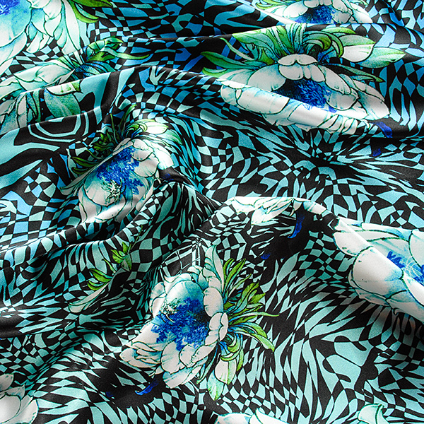 - digitálně potištěný atlas vhodný na společenské i letní šaty, sukně