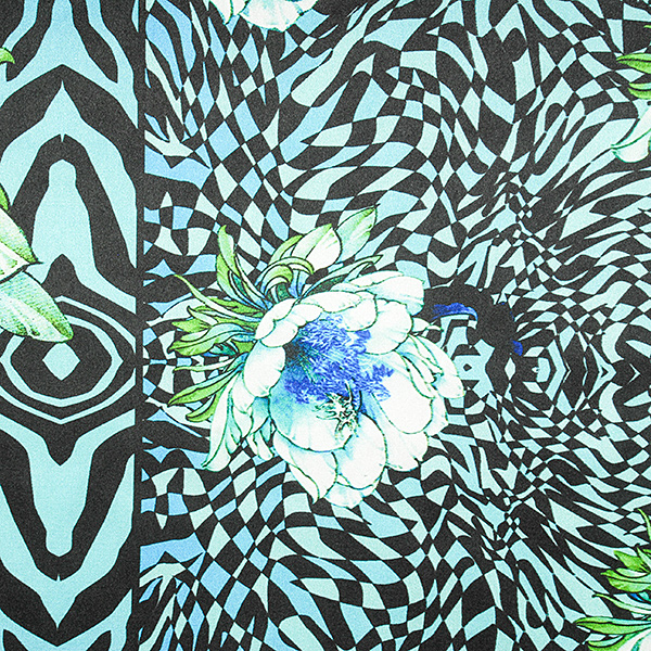 Atlas kupón leknín modrozelený romantický vzor květu leknínu v kombinaci s geometrickými vzory v jasných barvách zelené, modré, šerné, tykrysové a bílé. Atlas kupón leknín modrozelený vzor je digitálně tištěn na jemný pružný satén atlasové vazby, látka je hebká, pružná a splývavá.