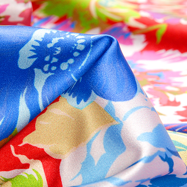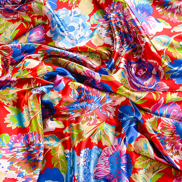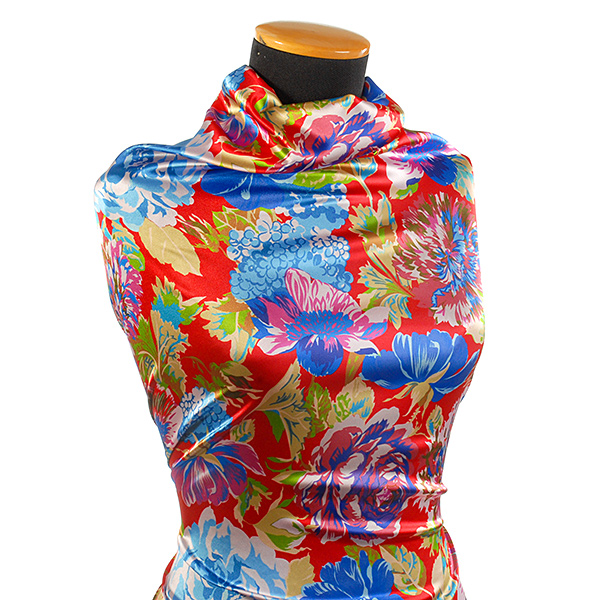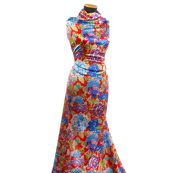 Atlasová lesklá látka s romantickým květinovým motivem velkých květů v barvách modré, růžové, fialové, khaky zelené na červeném podkladě. Vzor je digitálně tištěn na jemný pružný satén atlasové vazby, látka je hebká, pružná a splývavá.