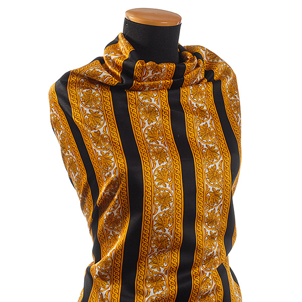 Bavlněná látka - pevnější látka se vzorem širokého pruhu s ornametny v barvách černé, zlatožluté a bílé. Látka je střední síly a lehce splývavá.
