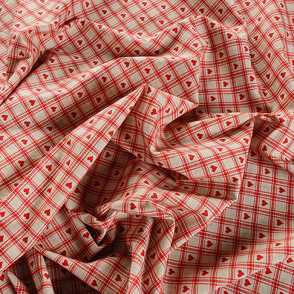 Bavlněná látka tisk kostiček a srdíček v barvách červené a režné. Metráž je lehce pružná vazbou a je mírně splývavá. Je vhodná i jako látka na patchwork.