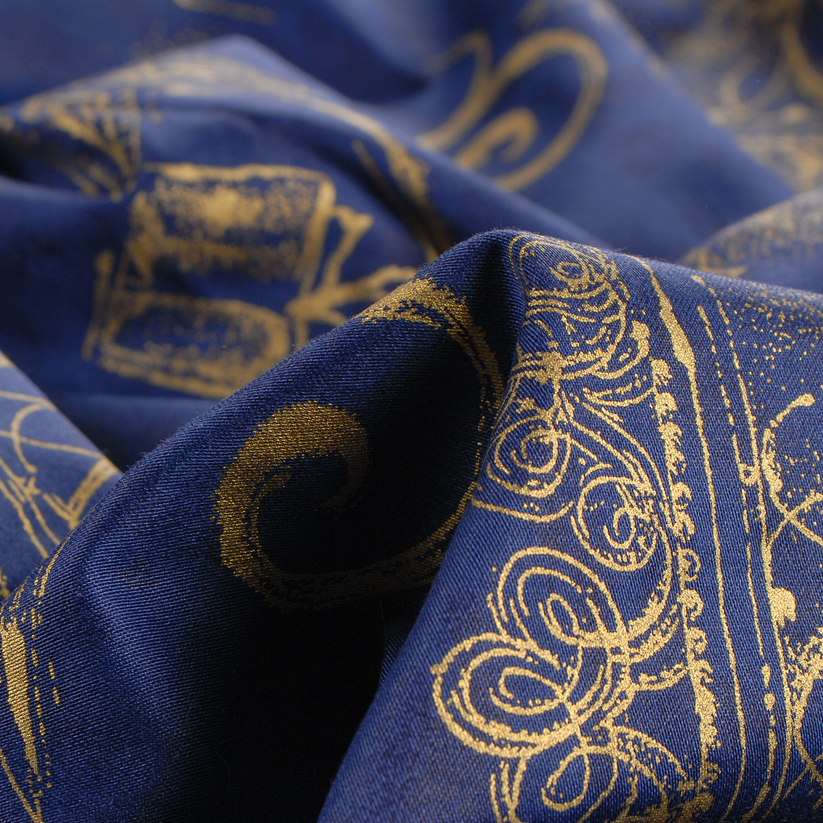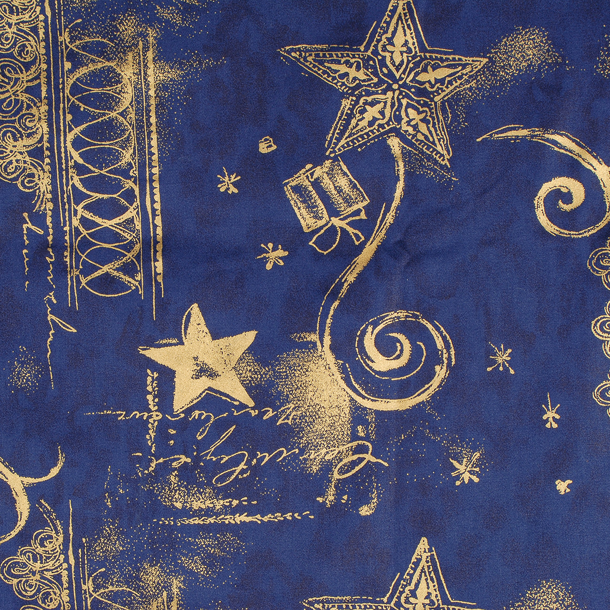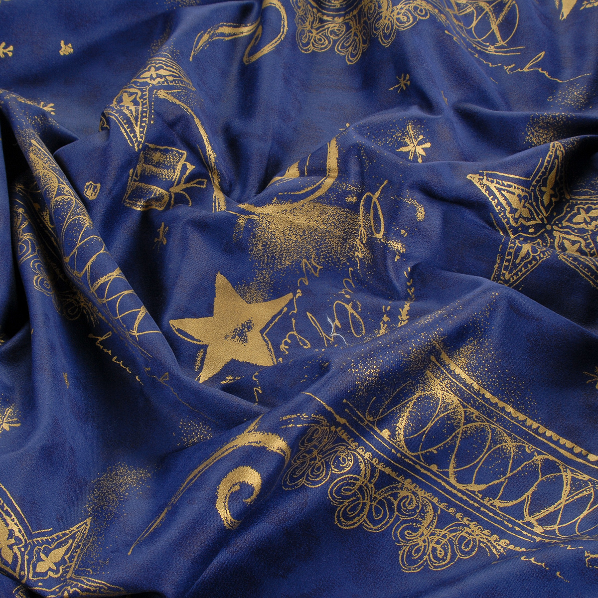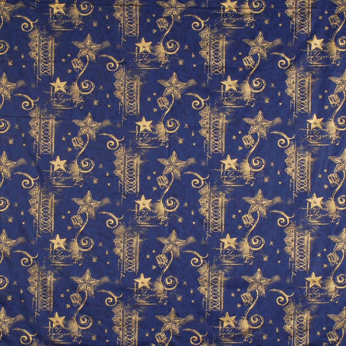 Bavlněná látka vánoční vzor se vzorem ornamentů vánočního vzoru, hvězdiček a blíčků ve zlaté barvě na podkladu tmavě modré barvy. Látka je lehce pružná svou vazbou, je mírně splývavá a vhodná i na patchwork.