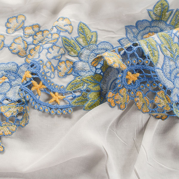 Bavlněná letní látka s výšivkou bílá/svělte modrá- jemná bavlněná látka s bordurovou výšivkou květů doplněna výšivkou richelieu v barvách pastel světle modré, světle žluté a světle zelené na bílém podkladě. Bavlněná letní látka s výšivkou bílá/světle modrá má jemný matný povrch, je splývavá a na sukně, či šaty doporučujeme podšívku. Látka není průsvitná, ale může být transparentní na barevné spodní prádlo.