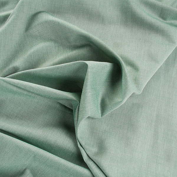 Bavlněné plátno jemné zelené barvy s matným povrchem v barvě zelenošedého melíru. Bavlněné plátno jemné zelené barvy je lehce splývavá, pružná svou vazbou a proti slunci je lehce transparentí.