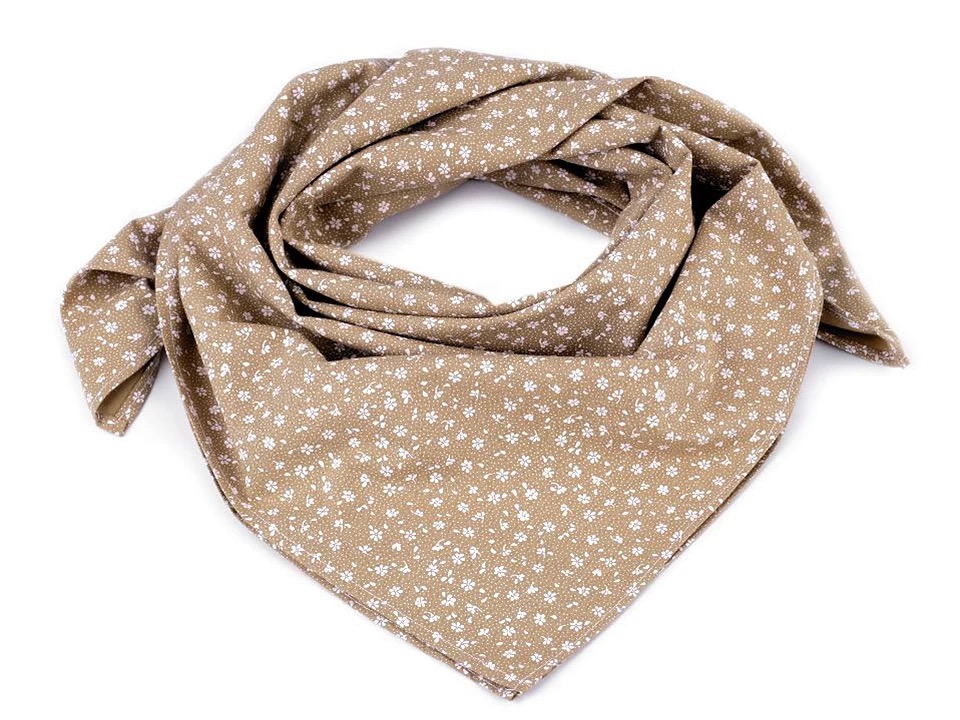 Bavlněný šátek drobné květy 65x65cm béžový- klasický bavlněný šátek s potiskem vzoru drobných květů bílé barvy na béžovém podkladě. Bavlněný šátek drobné květy 65x65cm béžový- šátek může být elegantním doplněkem k oděvu, ozdoba do vlasů, nebo na tašku, ale může sloužit i pro zahřátí v zimě kolem krku.