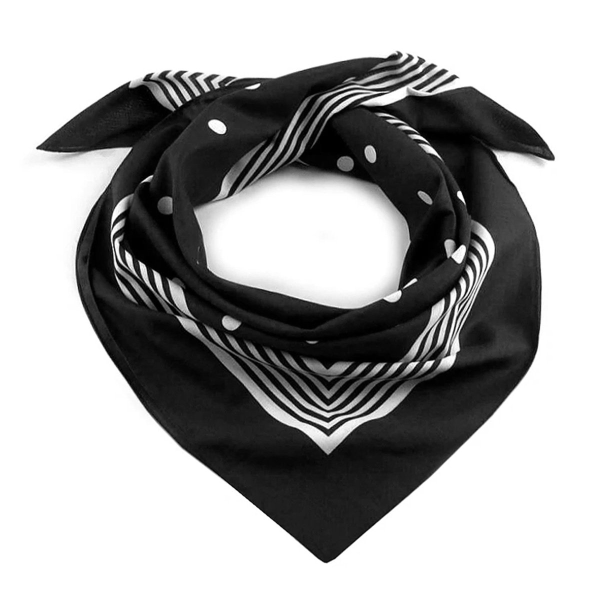 Bavlněný šátek vzor proužek puntík 70 x 70cm černý- klasický bavlněný šátek s potisekm vzoru puntíků a proužků v černobílých barvách. Šátek může být elegantním doplněkem k oděvu, ozdoba do vlasů, nebo na tašku, ale může sloužit i pro zahřátí v zimě kolem krku.