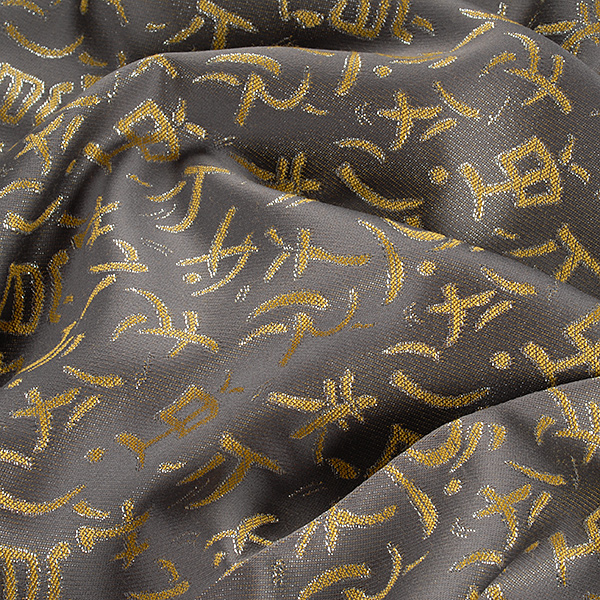 Brokát lamé motiv písma hnědožlutostříbrný-motiv čínského písma na hnědožlutostříbrném podkladu.Brokát lamé motiv písma hnědožlutostříbrný je jemnější látka, lehce splývavá se zlatým kovovým lesklým efektem. Brokát je oboustranný, můžet pro efekt použít rub i líc.