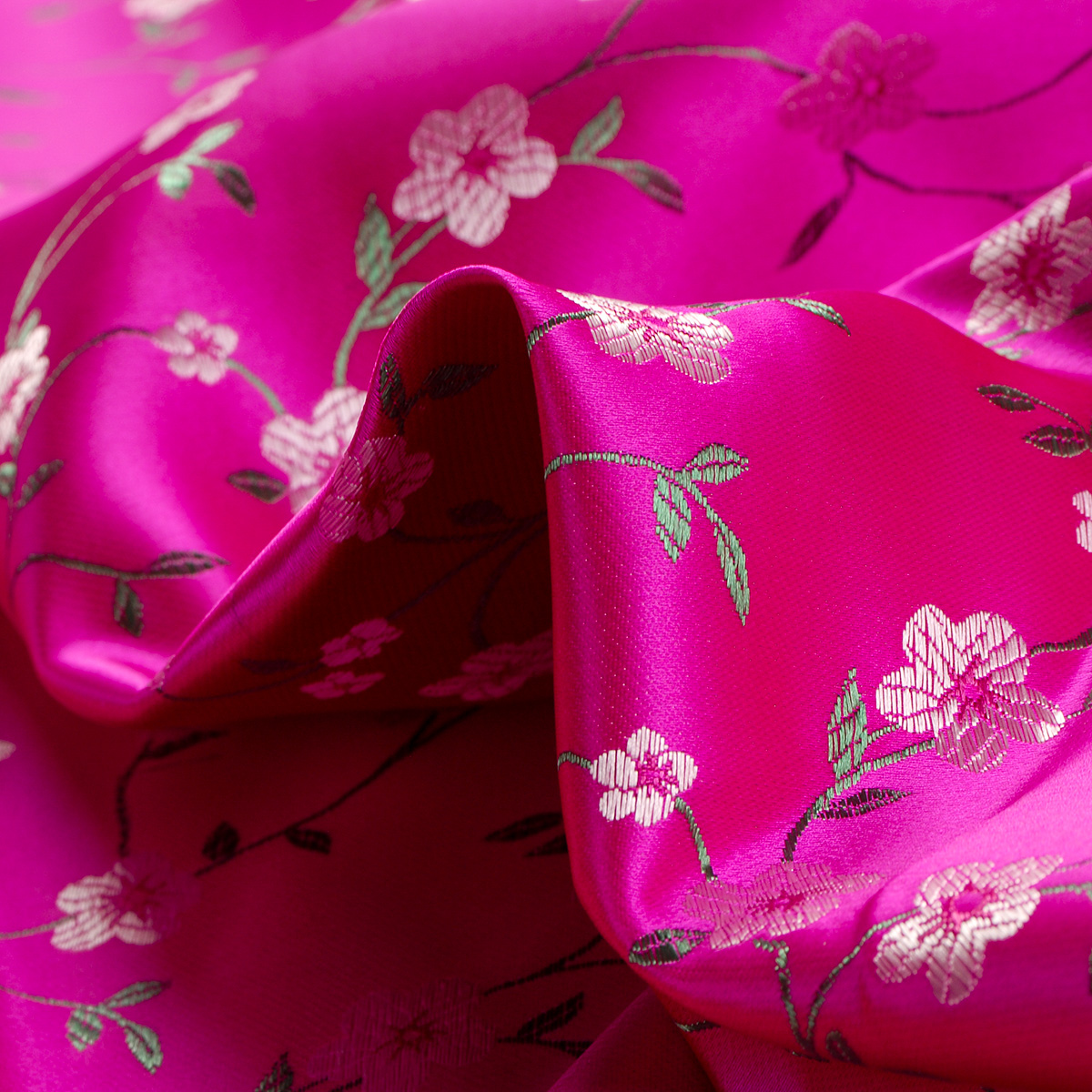 Brokát orientální vzor květů fuchsiový - žakárový tkaný brokát s orientálním motivem jemných barevných květů na podkladu fuchsiové barvy. Brokát orientální vzor květů fuchsiový látka je pevnější, jen lehce splývavá, má lesklý a jednostranný povrch.
