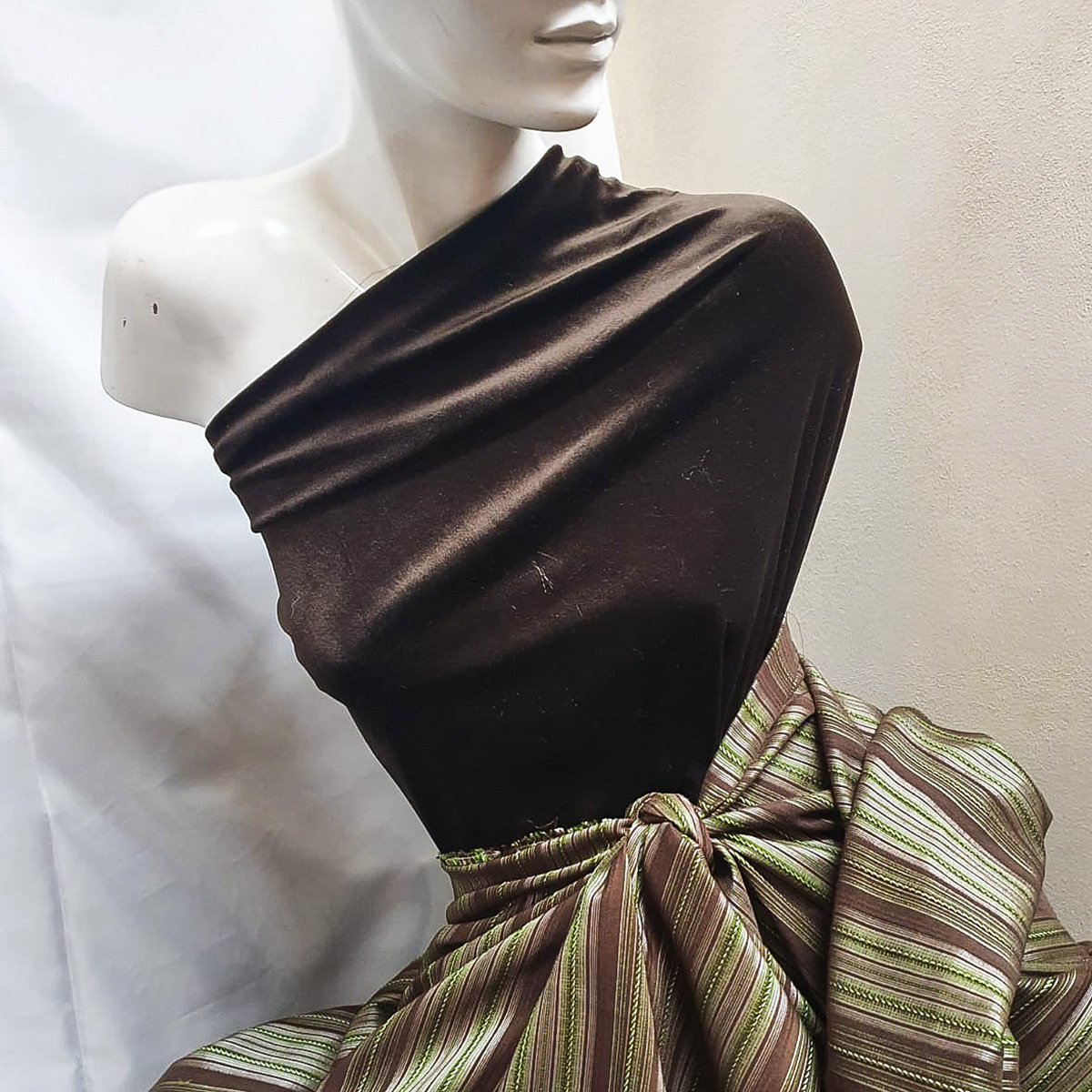Brokát pružný proužky zelenohnědý - jemná oboustranná žakárová látka brokát se vzorem proužků doplněna lehce plastickým zdobným krouceným proužkem v barvách zelené, hnědé, šedé se stříbrným leskem.Brokát pružný proužky zelenohnědý - látka je středně silná, hezky splývavá a je pružná po délce, ne po šířce POZOR střih je vhodné pokládát po délce látky.