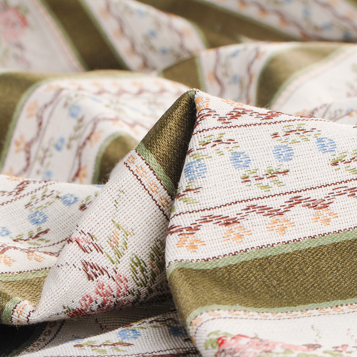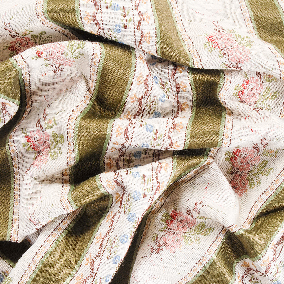 Žakárová dekorační tkanina replika historické látky z odbodí rokoka se vzorem proužků, květin a drobných květinových ornamentů v barvách zelené, světle šedé, růžové a hnědé. Látka je středně silná, lze ji použít na historické šaty z období rokoka, ale i jako dekorační tkaninu na závěs, čalonění dorbného nábyktu, nebo jako přehoz přes postel.
