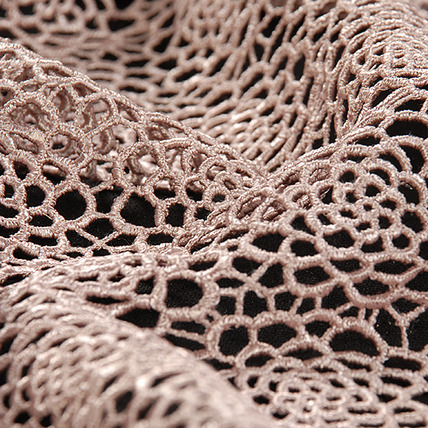 Efektní krajka s hrubým plastickým vzorem - látka s motivem květů starorůžové barvy. Krajka má oba kraje stejně zdobné, je průsvitná a splývavá. Je dost pevná a vhodná i na korzet.