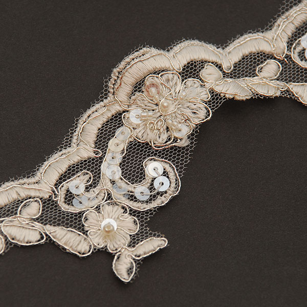 Exkluzivní lemovací krajkav metráží vhodná na dozdobení oděvu - výstřihu, délky svatebních šatů, rukávů, závojů a jiných aplikací. Jde o typ vzdušné krajky na tylu, mírně pružné s motivem květů. Je široká v rozmezí od 3,5 až do 8cm a je vyšívaná a dozdobena korálky i flitry. Velikost květů je cca 2 cm.