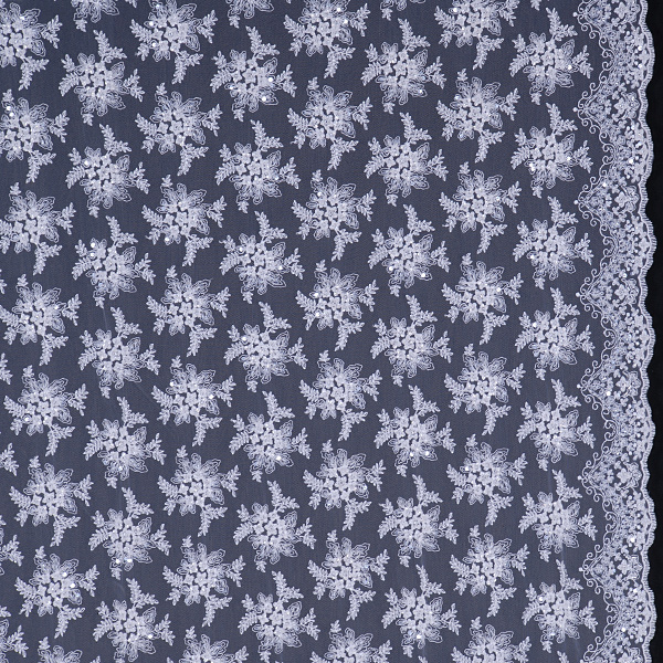 Efektní krajka výšivka na tylu v bílé barvě s květinovým motivem plnějšího vzoru. Výšivka květů je bílé barvy dozdobena perličkami, rokajlem a flitry. Metráž je pružná svou vazbou, splývavá a průsvitná.