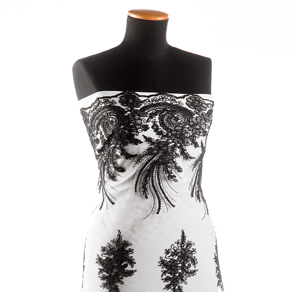Efektní krajka výšivka na smetanovém tylu černá efektní květinový motiv černé barvy na vzorovaném tylu smetanové barvy.Efektní krajka výšivka na smetanovém tylu černá je pružná svou vazbou, splývavá a průsvitná.