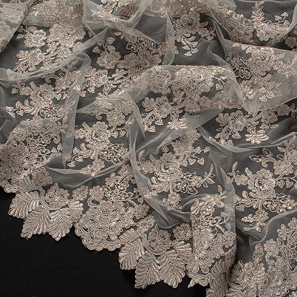 Efektní krajka výšivka na tylu ve světle šedé barvě s květinovým motivem. Metráž je pružná svou vazbou, splývavá a průsvitná.