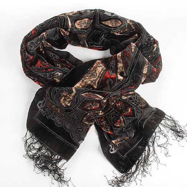 Efektní šál vypalovaný samet doplněn tiskem - šál s romantickým motivem tvořeným kombinací sametu, šifonu a tisku působí elgantně a nevšedně. Šál je v barvách černé, vínové a hnědobéžové barvy na černém podkladu s bílým tiskem. Je jednostranný, splývavý s jemnými třásněmi o délce 17 cm. Šíře šály cca 55 cm a délka bez třásní cca 150 cm.