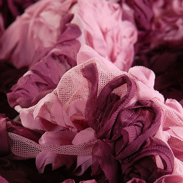 Efektní tyl s květinovou aplikací látka s plastickým motivem květů vínové a starorůžové barvy na růžovém podkladuEfektní tyl s květinovou aplikací - je průsvitná a jemná látka, pružná svou vazbou a splývavá.