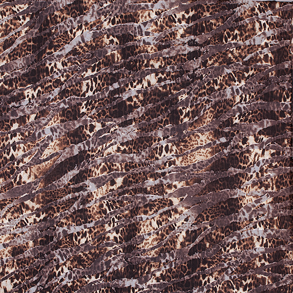 Efektní úplet se zvířecím motivem a plastickým zpracováním, tvoří dojem 3D. Strukturou je místy průsvitná podobna vypalovanému sametu. Látka je pružná, splývavá a poddajná.