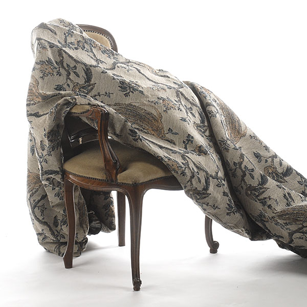 Exkluzivní dekorační tkanina s motivem exotického ptactva ve větvích s květy zlatobéžové a modré barvy na béžovém podkladu. Dekorační látka je vyrobena ve vlastní tkalcovně firmy Marlen.