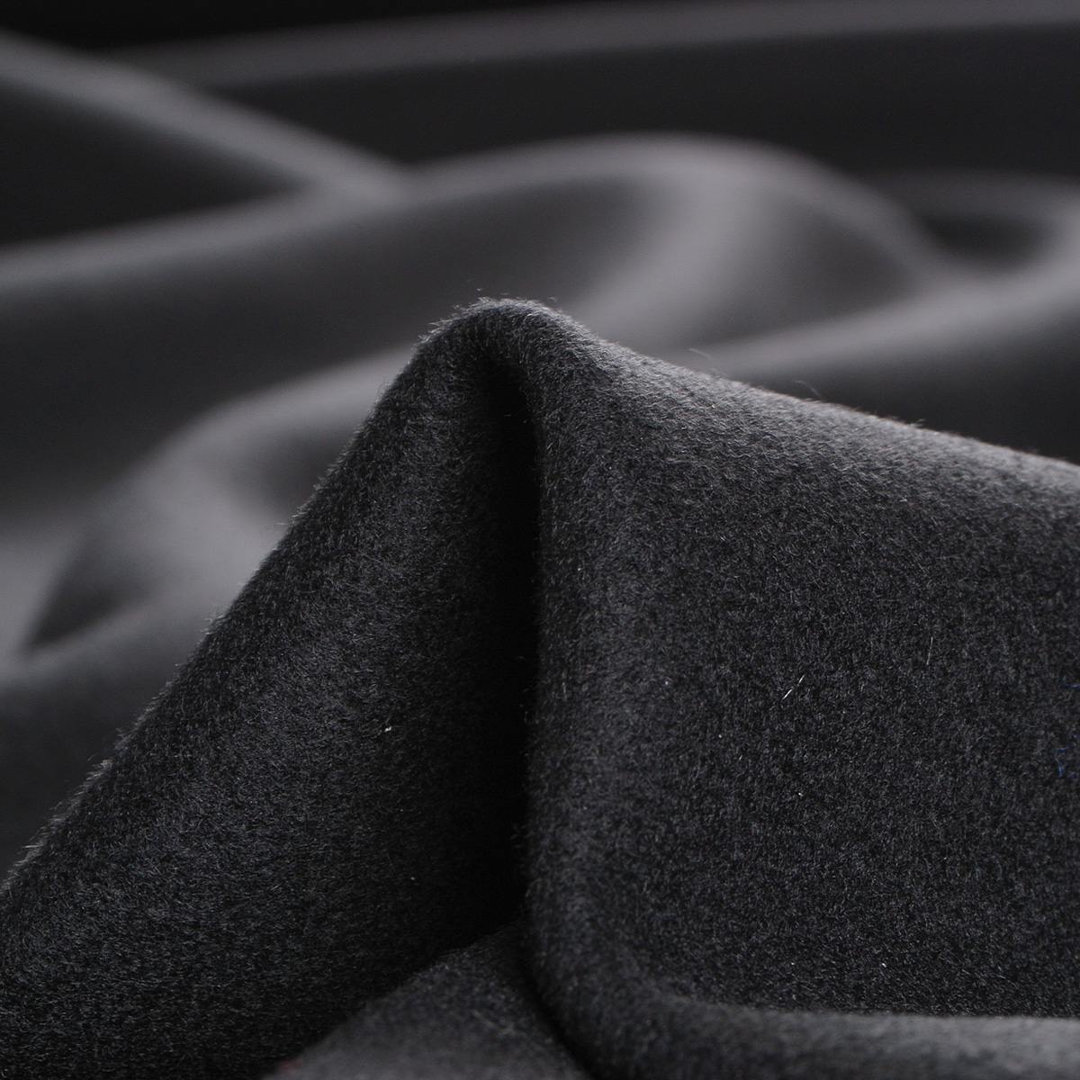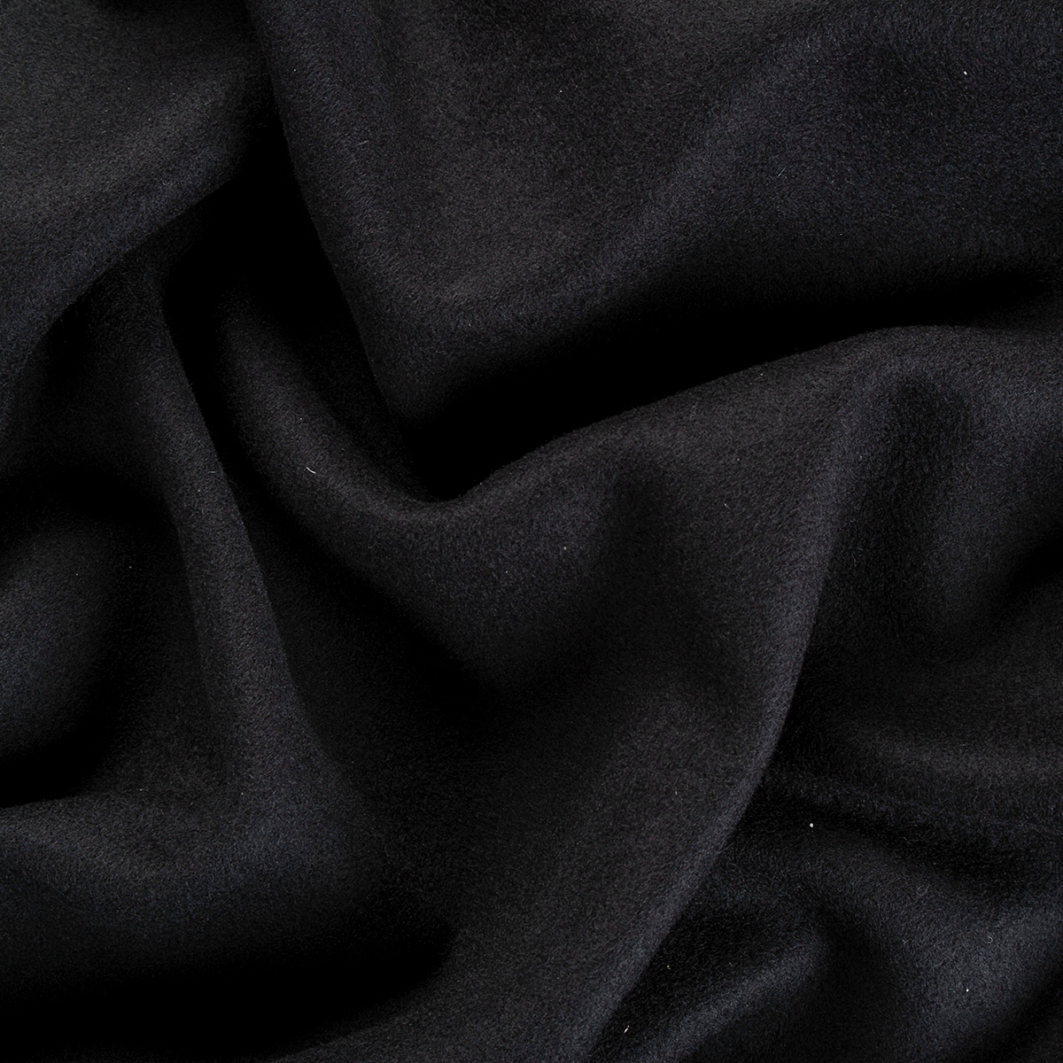 Hřejivá zimní vlněná látka směs v modročerné barvě s jemným vlasem vhodná na kabát či teplé sako. Látka je pevnější, na omak ale působí jemně a nadýchaně.