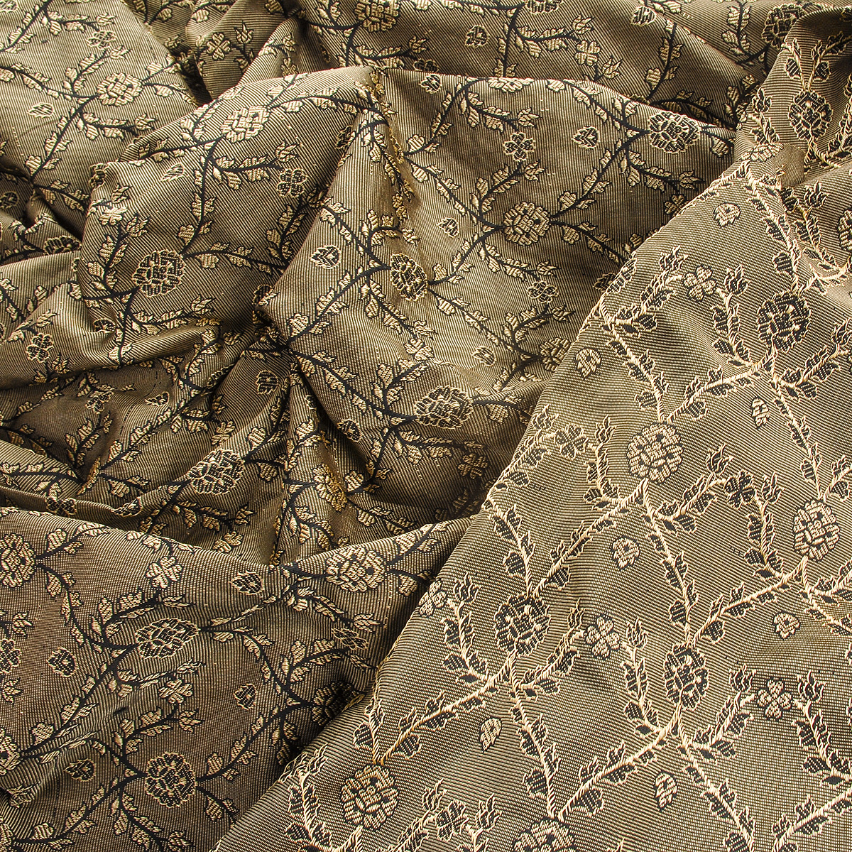 Hedvábný brokát s květinovým vzorem starozlatý látka s jemným květinovým šlechtickým vzorem černé barvy na podkladu starozlaté barvy.Hedvábný brokát s květinovým vzorem starozlatý má mírný lesk, látka je lehce splývavá. Na sako i korzet je potřeba zpevnit lepením, bude krásně držet tvar. Metráž je vhodná na dobové šlechtické historické kostýmy.