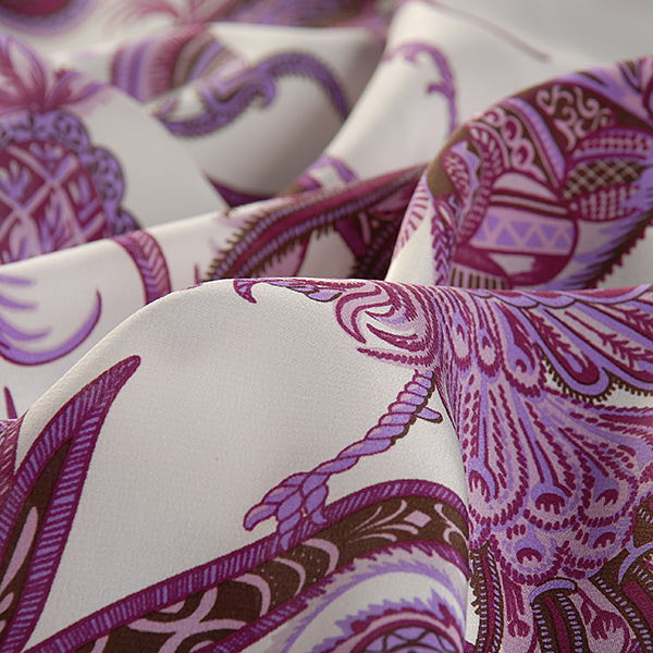 Hedvábný krepdešín látka paisley vzor a exotický motiv páva v barvě levandulově fialové a růžové na podkladu barvy slonové kosti. Vzor je digitálně tištěn na jemný krepdešín. Látka je jemná a splývavá.