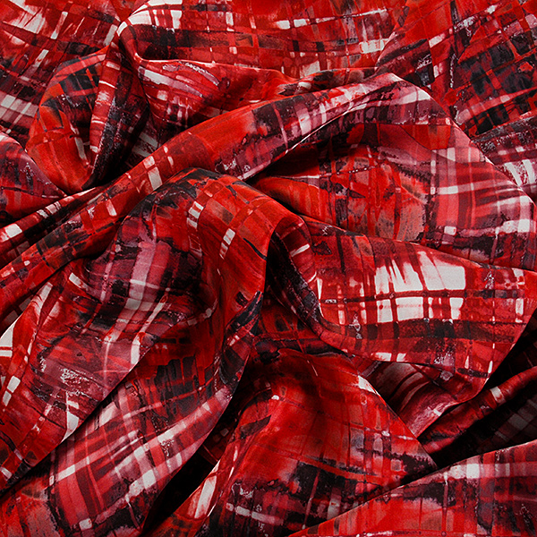 Hedvábný satén matný s abstraktním motivem v červených a vínových barvách. Hedvábný satén má digitálně tištěný vzor, látka je hebká, pružná svou vazbou a splývavá, má matný povrch.