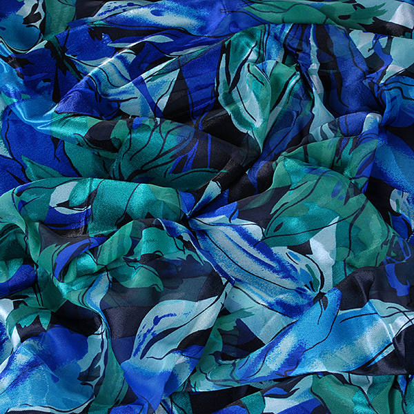 Hedvábný šifon žakár/tisk - efektní látka kombinace žakárového vzoru s tiskem. Motiv velkých květů v zelených a modrých barvách na černém podkladě. Látka je velmi elegantní, průsvitná a splývavá. Digitální tisk - barvy jsou výrazné a syté.