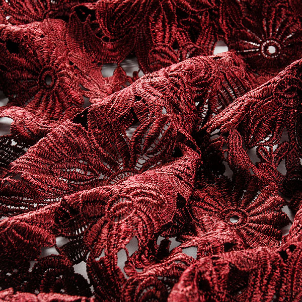 Hrubá krajka vínová - krajka s větším květinovým vzorem .Hrubá krajka vínová je pevnější, průsvitná a lehce splývavá.
