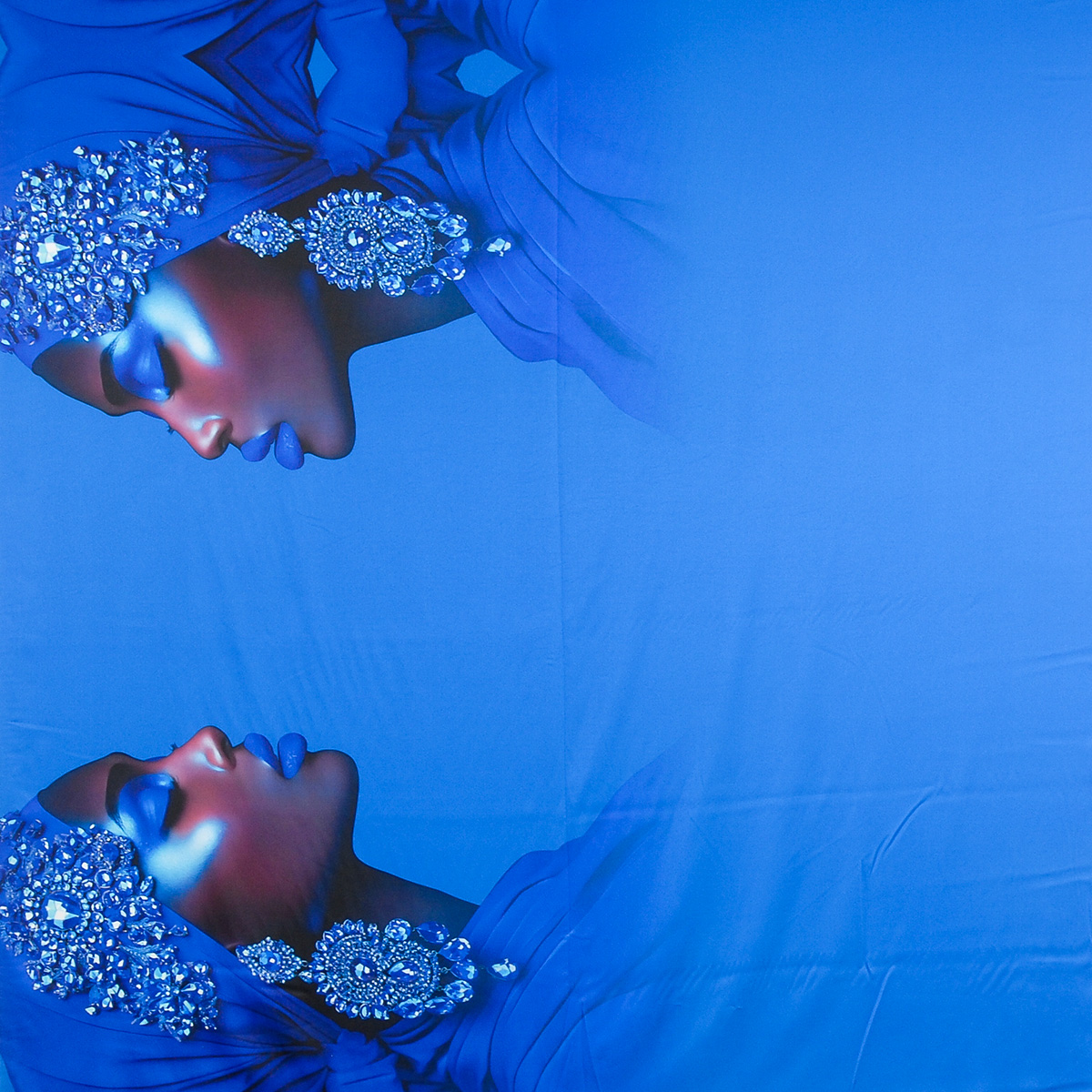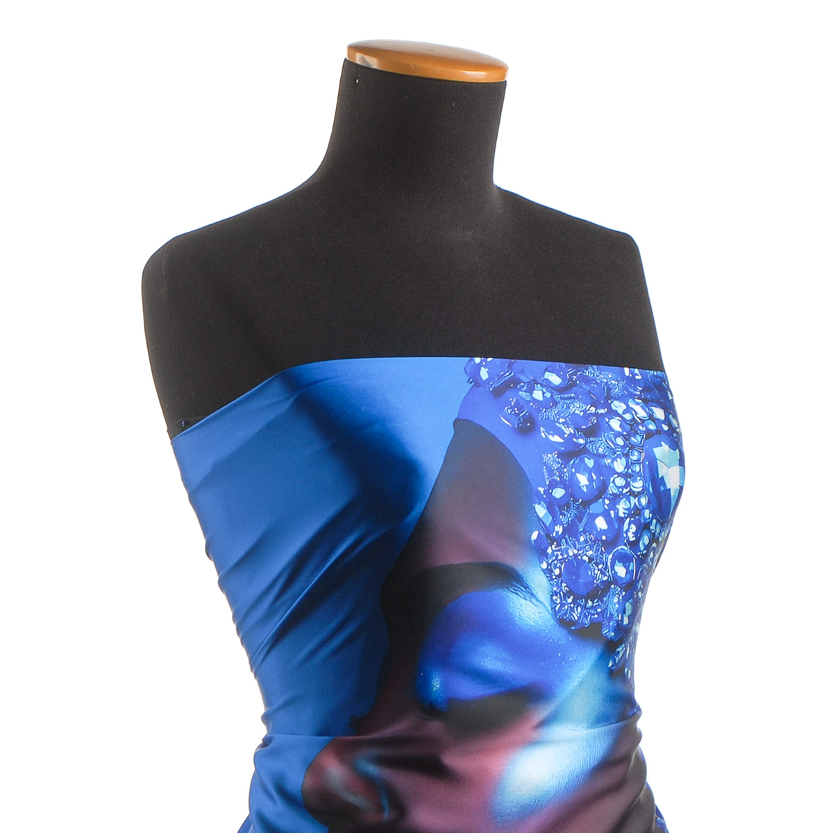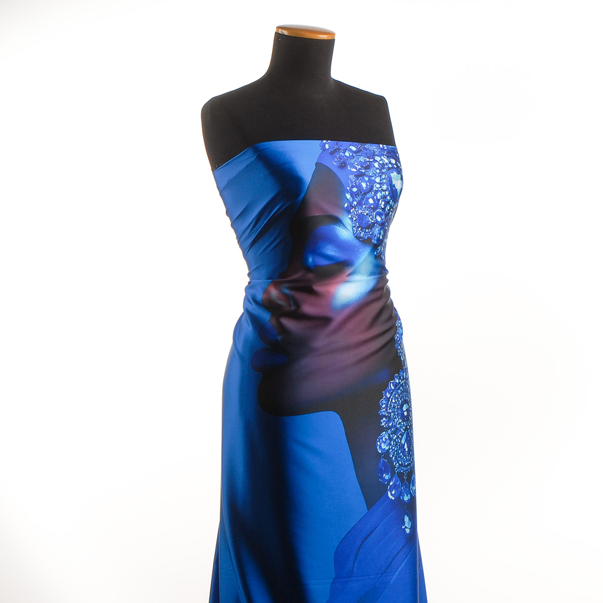 Imitace hedvábí pružný atlas Dámy v modrém jemná látka atlasové vazby s digitálním potiskem motiv dámy se šperky v modročerném na podkladě barvy nivea modré.Imitace hedvábí pružný atlas Dámy v modrém jemná saténová látka s matným povrchem, pružná a bohatě splývavá, je velmi příjemná na omak a není průsvitná.