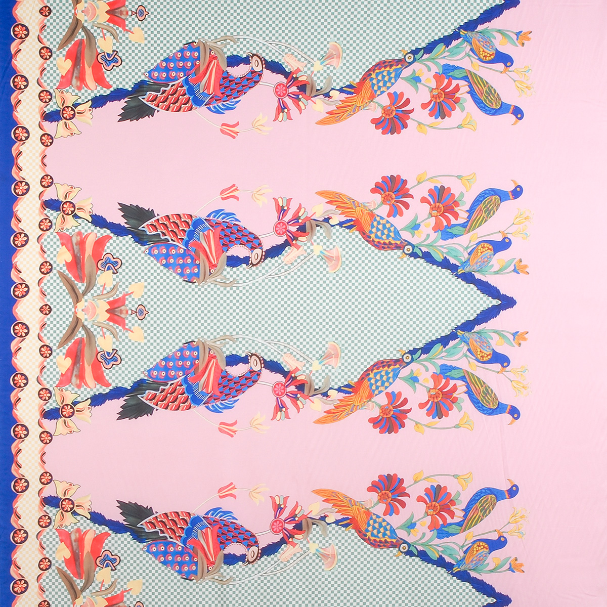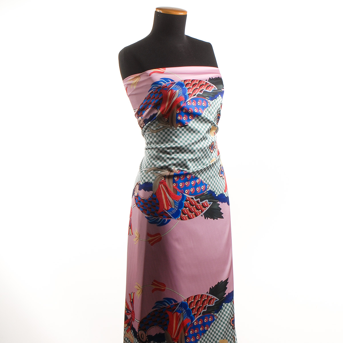Velikost vzoru: vzor je uložen po délce látky, na panelu/kupónu je tedy šířka vzoru 70 cm a délka vzoru 150 cm, středem panelu jde celý vzor a do krajů přechází v jednobarevný růžový podklad. Celý vzor je vlký cca 60 cm na šířku a 133 cm na výšku. Na jedny dlouhé šaty bez rukávů do velikosti 40/42 je potřeba dva kupóny, na krátké šaty s krátkými rukávy do velikosti 40/42 stačí také dva kupóny.