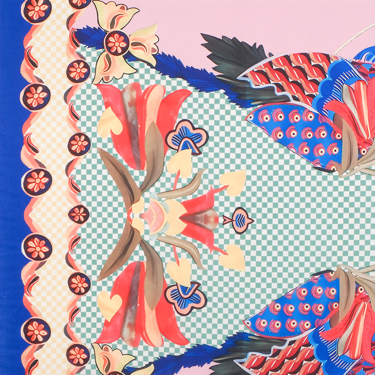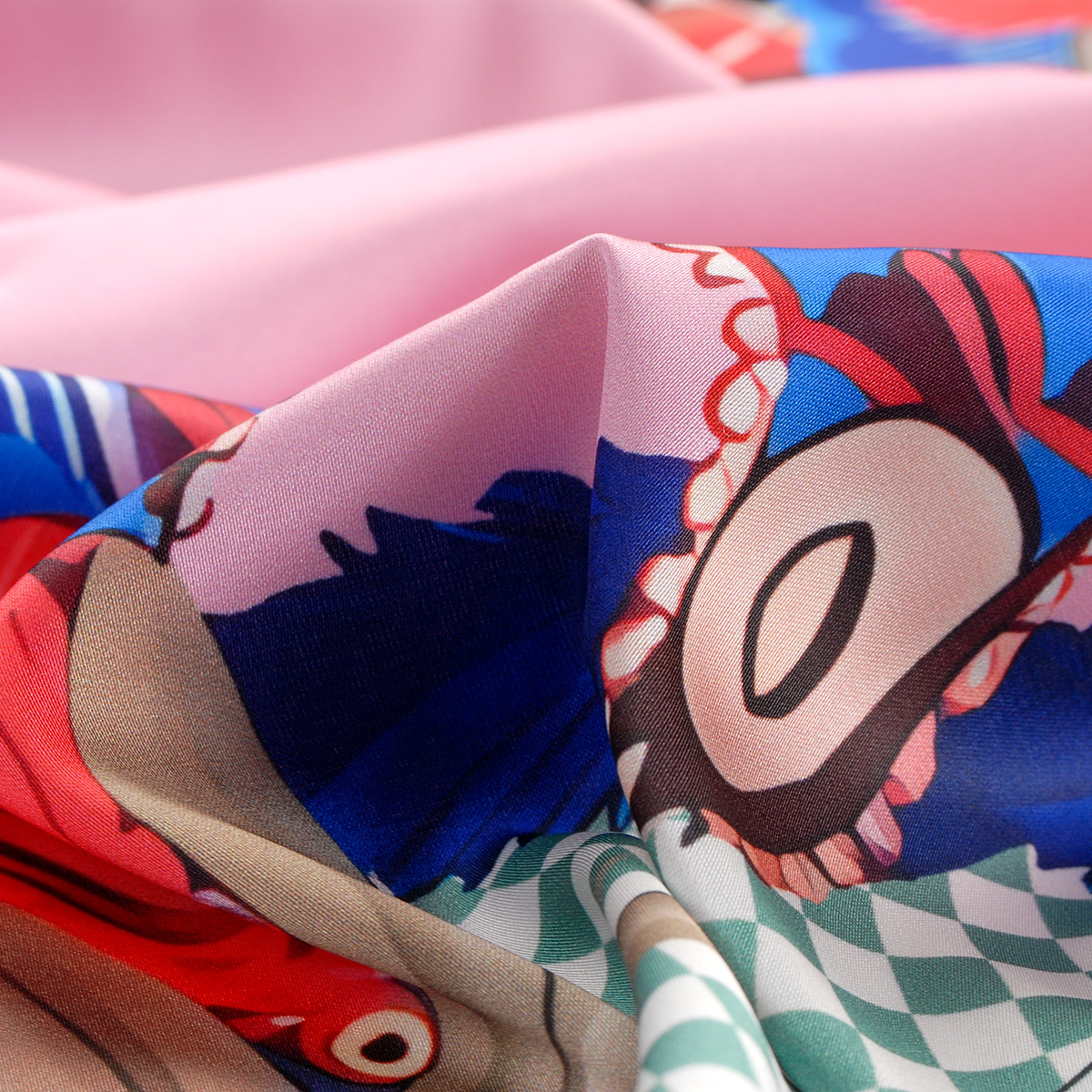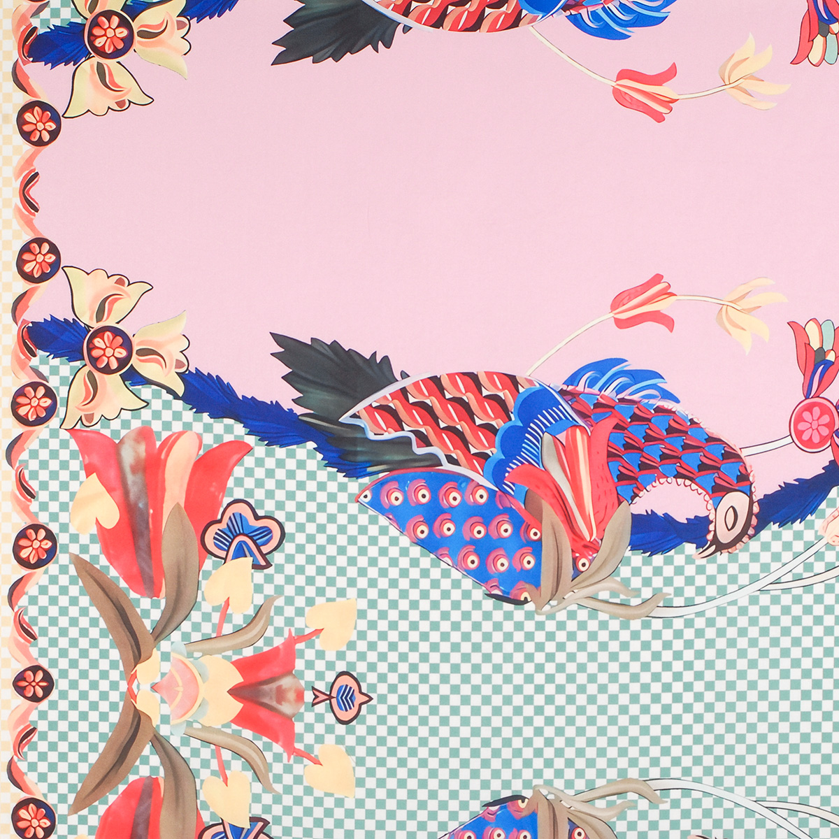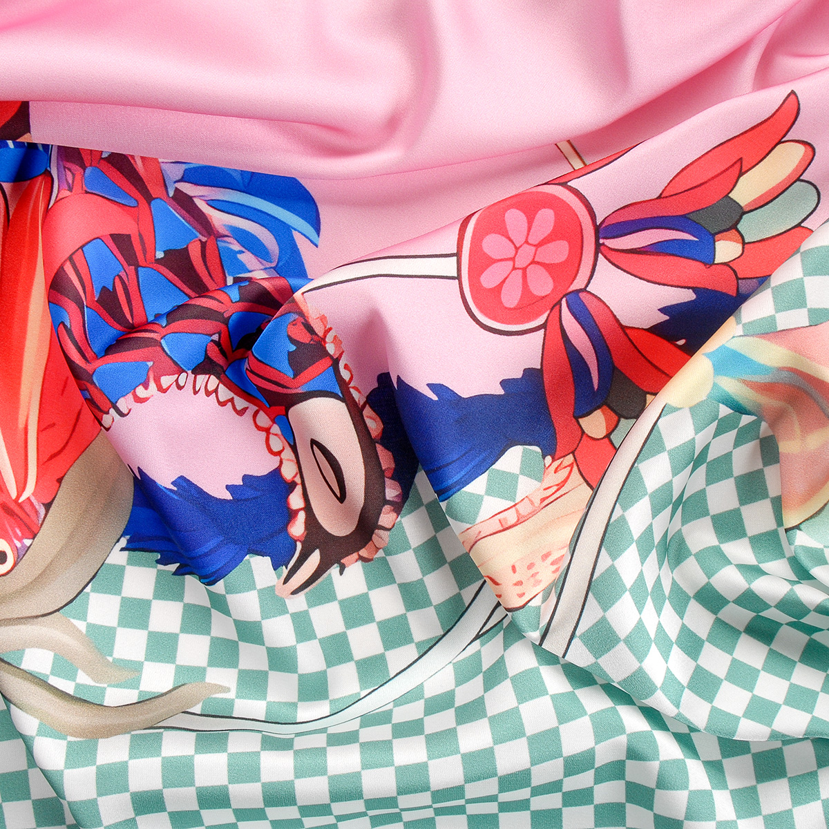 Imitace hedvábí pružný atlas Retro Birds růžová jemná látka atlasové vazby s digitálním potiskem nevšedního retro vzoru kombinace geometrického motivu s květinovým a zvířecím vzorem na podkladě pastel růžové barvy.Imitace hedvábí pružný atlas Retro Birds růžová jemná saténová látka s matným povrchem, pružná a bohatě splývavá, je velmi příjemná na omak a není průsvitná.