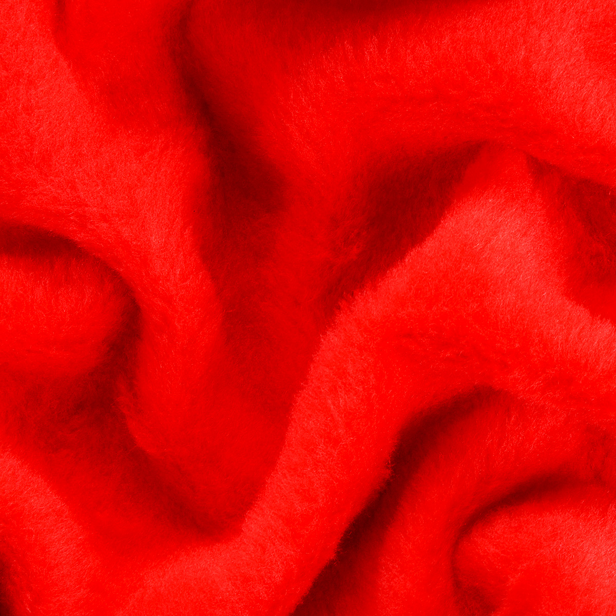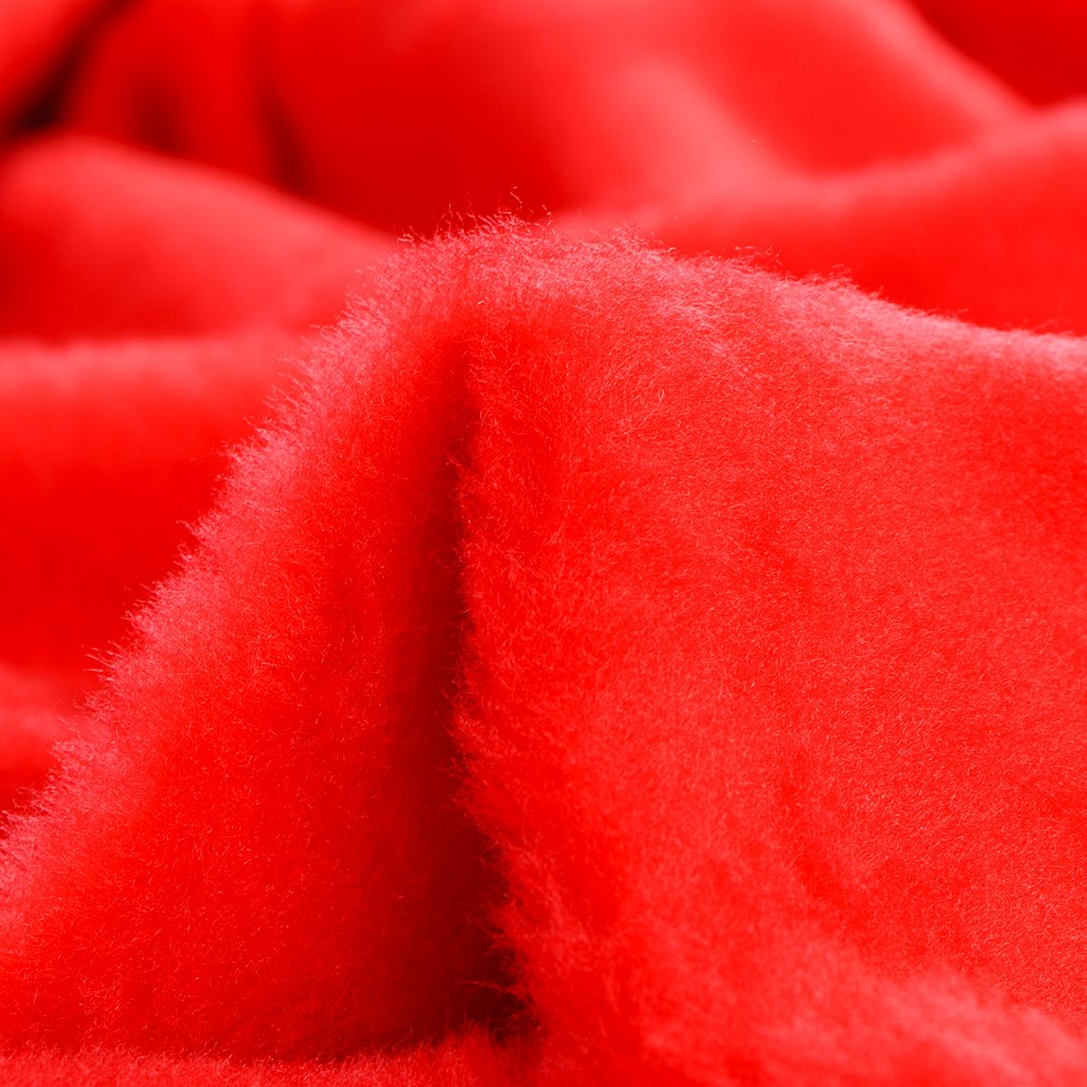 Imitace zvířecí srsti umělá kožešinav červené barvě. Látka má nízký vlas dlouhý cca 1 cm. Doporučujeme neprat, pouze chemicky čistit.