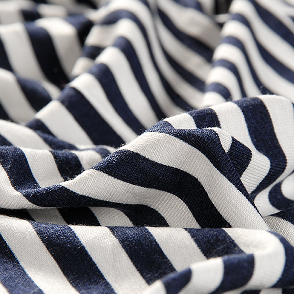 Látka, metráž pletenina úplet - jemný viskozový úplet s motivem proužků v barvách tmavě modré a bílé. Látka je jemná,pružná a splývavá.