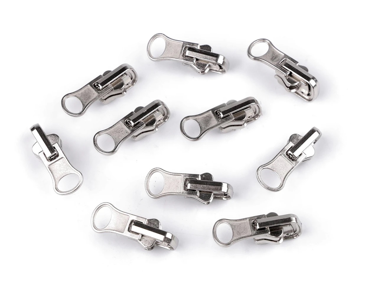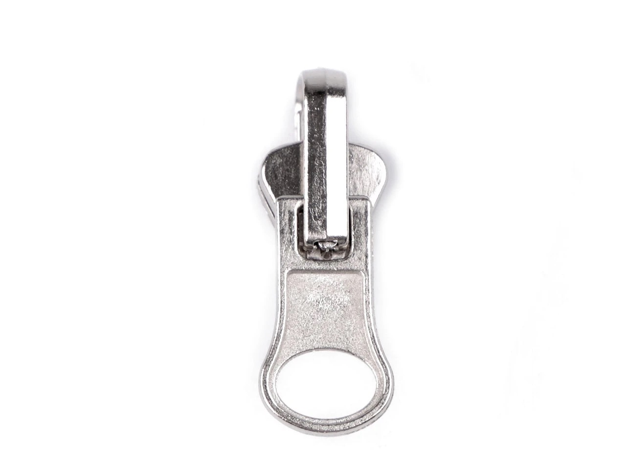 Jezdec ke kostěným zipům T5 ALFA No. 5 s aretací stříbrný- mohutný kovový jezdec ke kostěnému zipu vel T/5 AL vhodný na výměnu poškozeného jezdce u zipu, nebo k zipu v metráži.