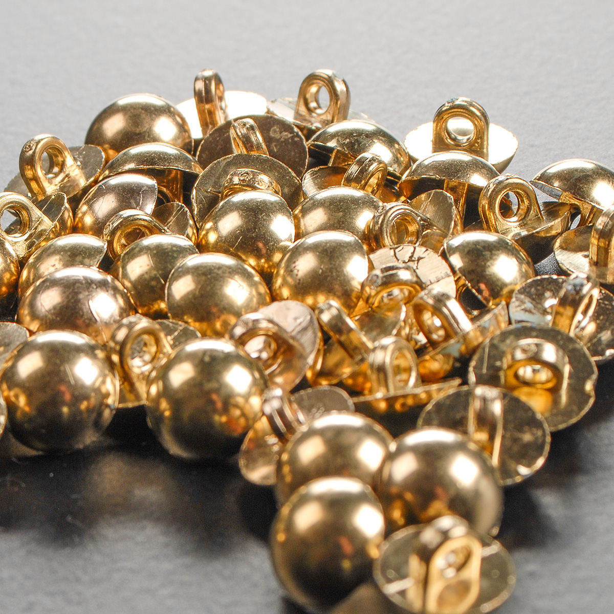 Tento malý půlkulatý plastový knoflík ve starozlaté barvě s vysokým leskem je perfektním detailem pro každého, kdo hledá eleganci spojenou s praktičností. Knoflík má výrazné vypoulení a hladký povrch bez vzoru, který krásně odráží světlo. Díky spodnímu přišití na krček (ouško) zůstává nit na lícové straně oděvu zcela skrytá, což dodává výslednému modelu profesionální a čistý vzhled.
