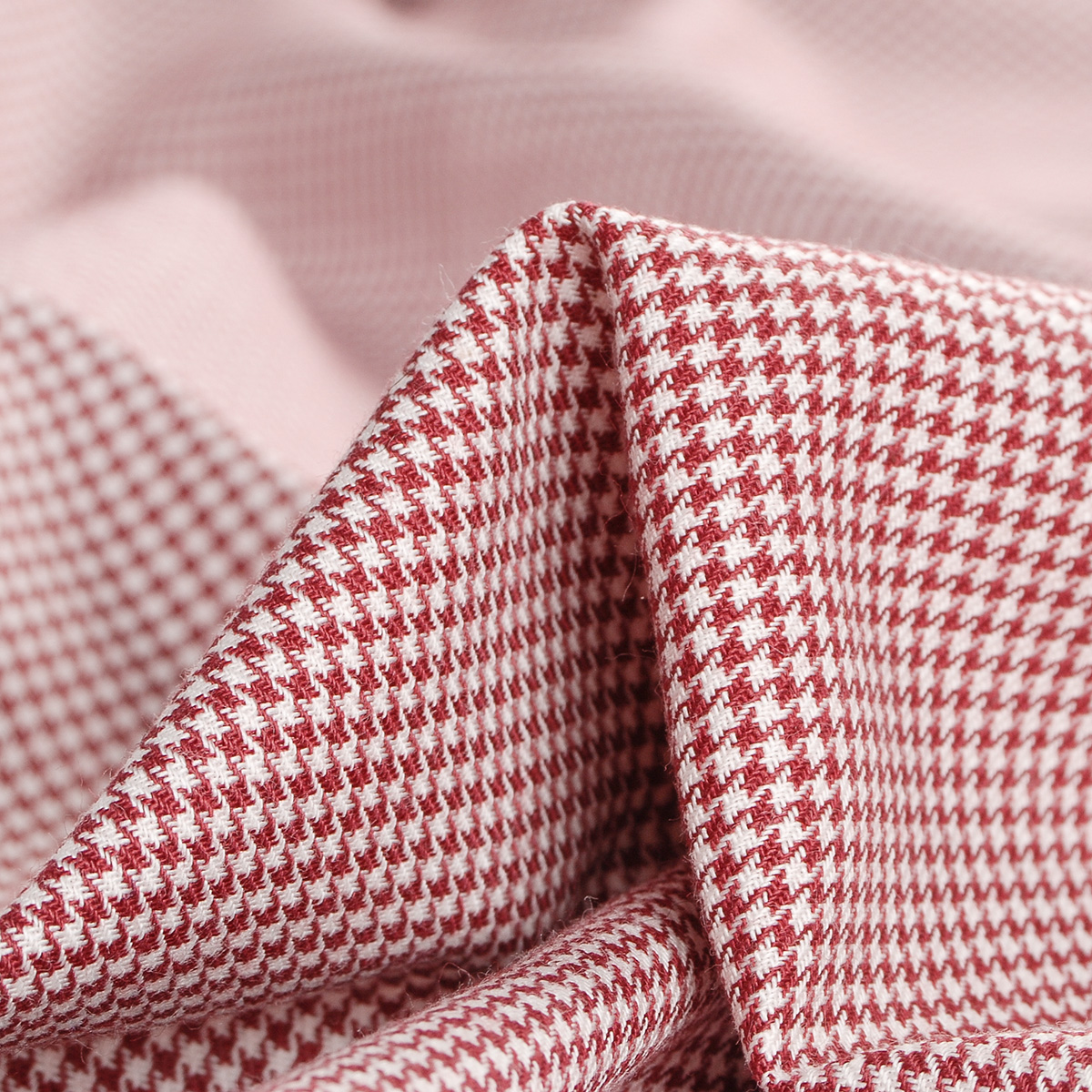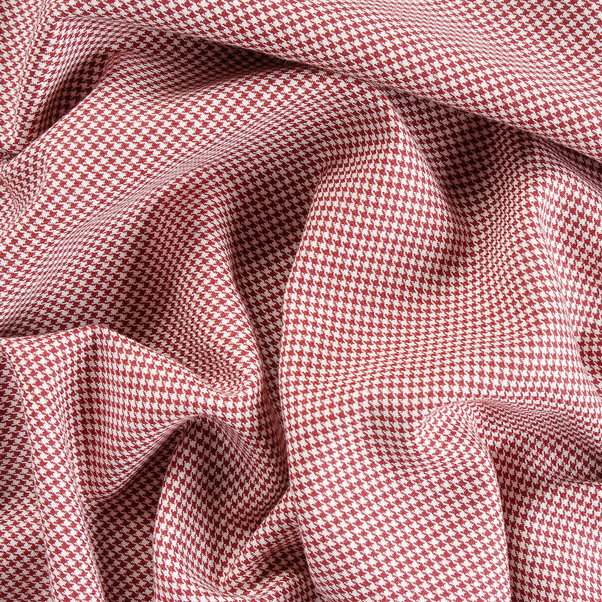 Kostýmová bavlněná látka vzro pepito nebo i kouhotí stopa v barvách tmavší červené a bílé. Látka je středně silná, s matným povrchem, je lehce splývavá a pružná, je vlemi příjemná na omak.