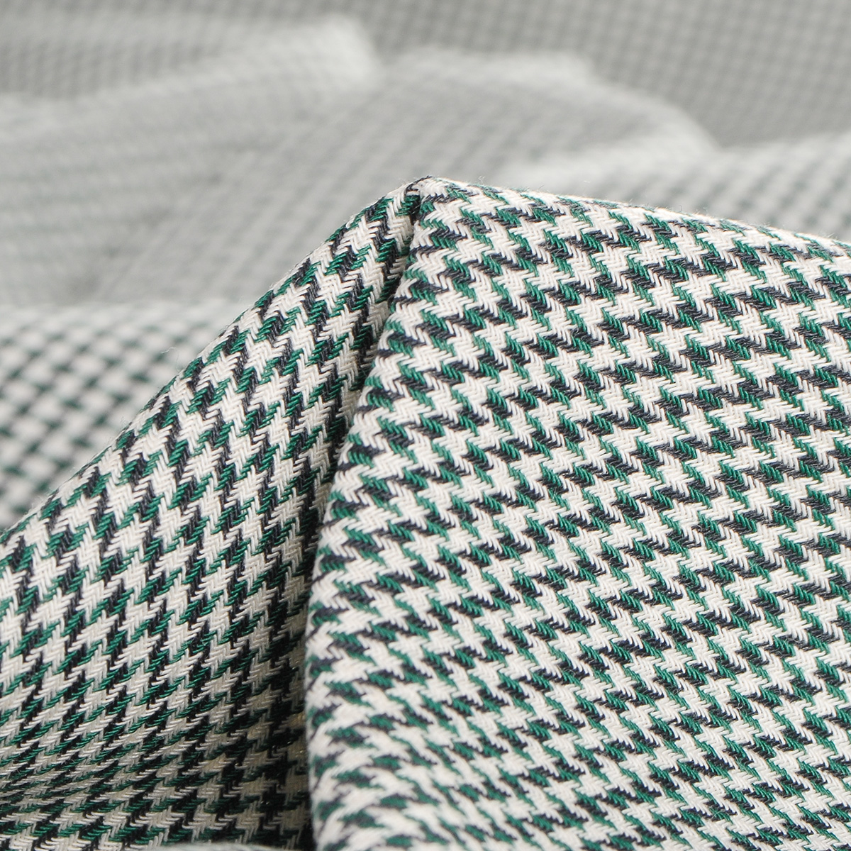 Kostýmová bavlněná látka vzro pepito nebo i kouhotí stopa v barvách zelené a bílé. Látka je středně silná, s matným povrchem, je lehce splývavá a pružná, je vlemi příjemná na omak.