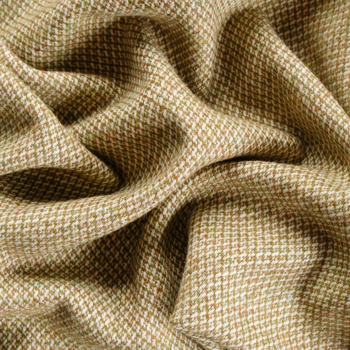 Kostýmová látka podobna ručně tkané metráži s lehce plastickou strukturou zatkaných nití v barávch mechově zelené a smetanové. Tkanina je lehce splývavá, je příjemná na omak, má drobný vlas. Rub i líc jsou rozdílné, lze pro efekt použít oboustranně.