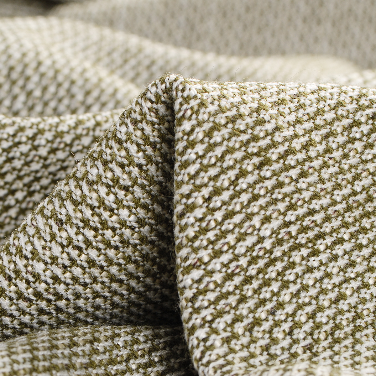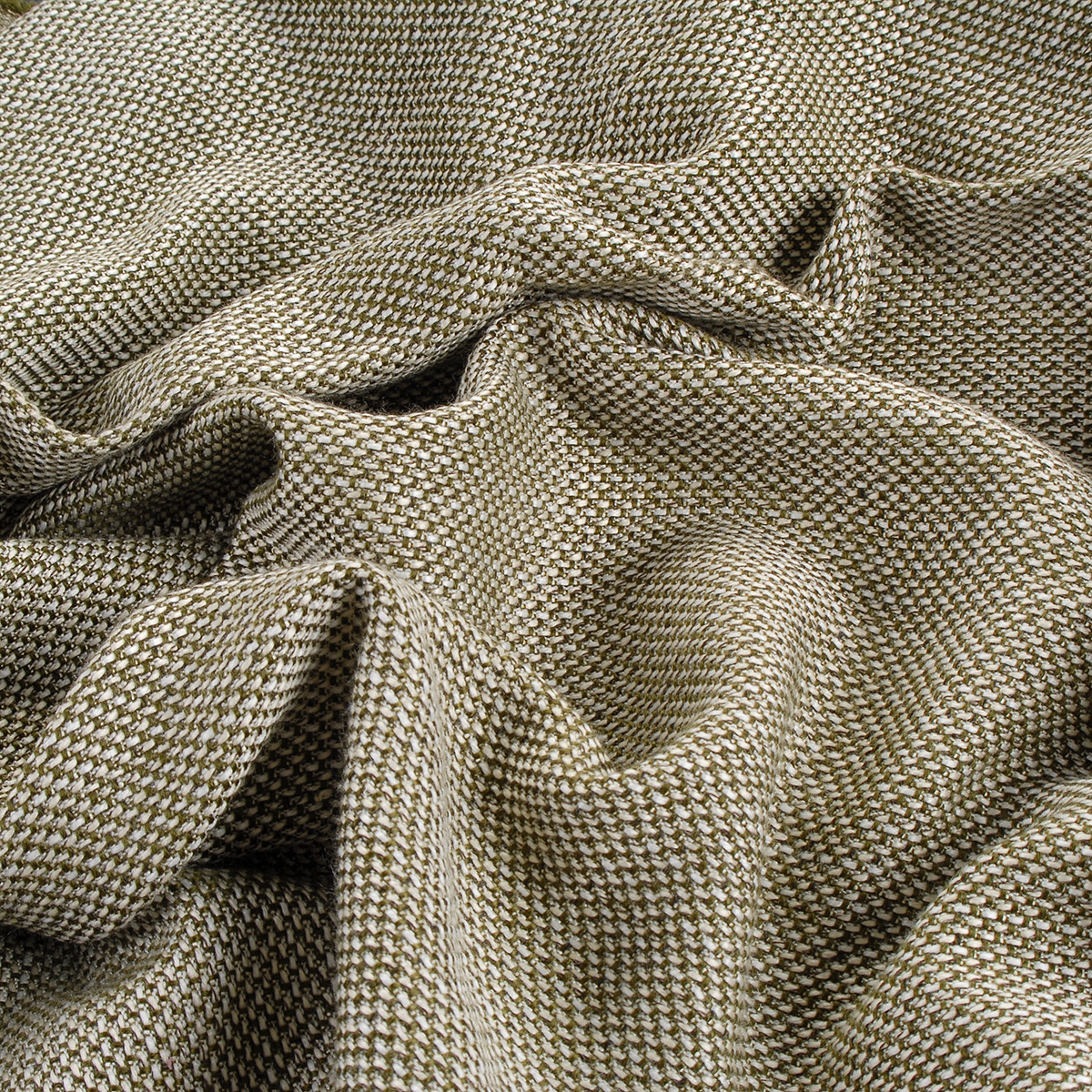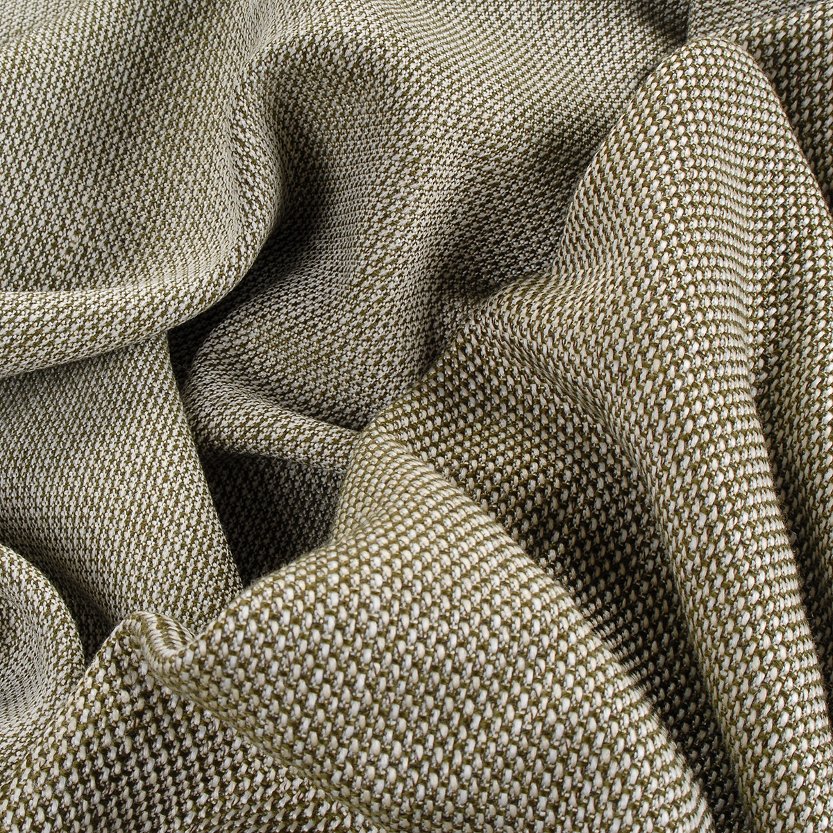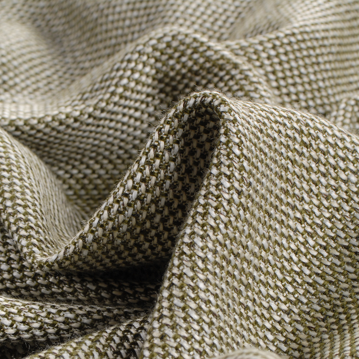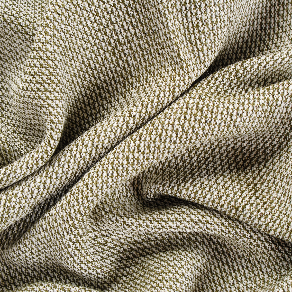 Kostýmová látka podobna ručně tkané metráži s lehce plastickou strukturou zatkaných nití v barávch mechově zelené a lomené bílé. Tkanina je lehce splývavá, je příjemná na omak a světlejší zatkané nitky mají lehce lesklý povrch. Rub i líc jsou rozdílné, lze pro efekt použít oboustranně.