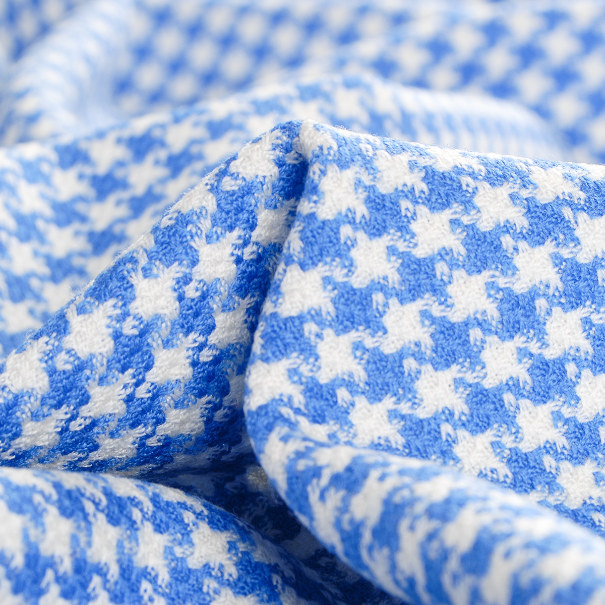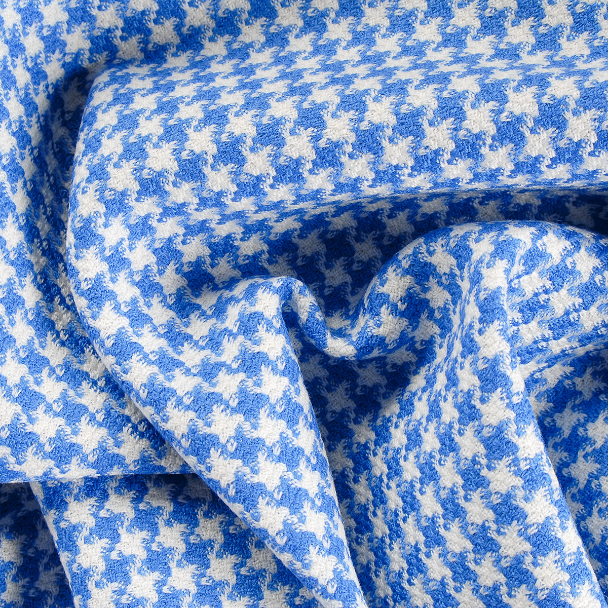 Kostýmová vlněná látka vzro pepito nebo i kouhotí stopa v barvách modré a bílé. Látka je středně silná, s matným povrchem, je lehce splývavá a pružná svou vazbou.