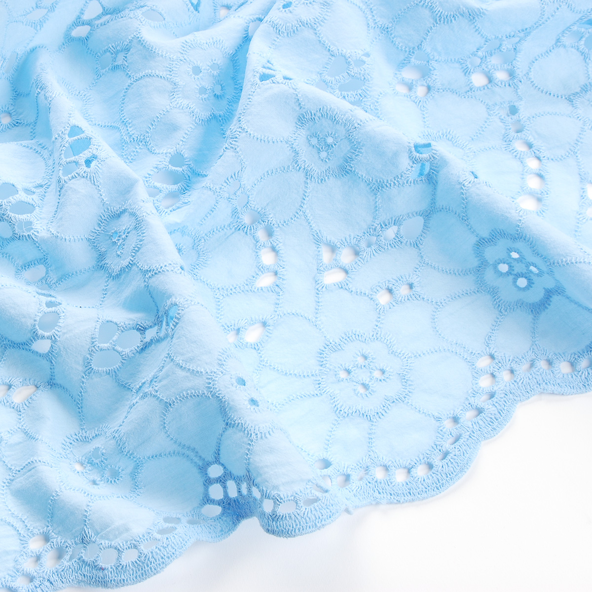 Krajka madeira celoplošná výšivka velký květ sv.modrá- jemná bavlněná látka s celoplošnou výšivkou motivu velkého květu v barvě blankytně světle modré. Krajka madeira celoplošná výšivka velký květ sv.modrá je mírně pružná svou vazbou, lehce splývavá a v místech "dírek" průsvitná.