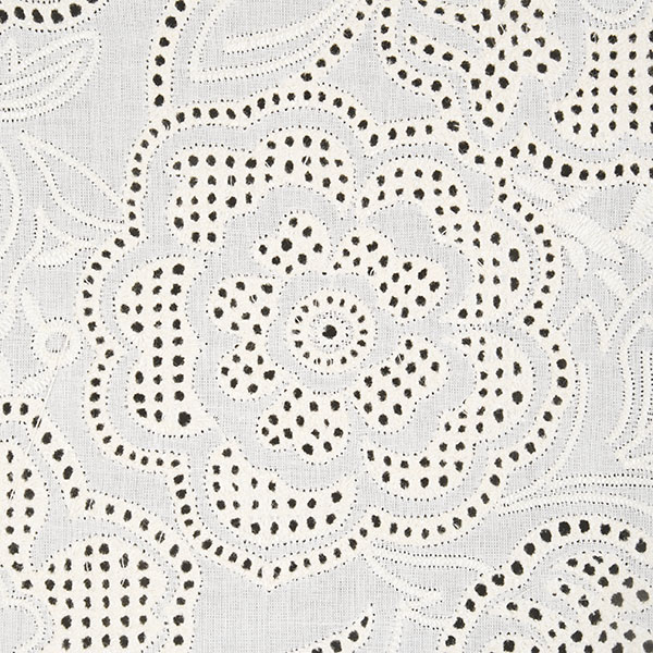 Vzor:Šířka vyšívané bordury je cca 29 cm,výšivku tvoří květy smetanové barvy velké cca 8x8 cm,navazují na sebe po cca 7 cm,bordura je pouze na jednom kraji látky,zbývající šířka bavlněné látky bez vzoru má lomenou bílou barvu.