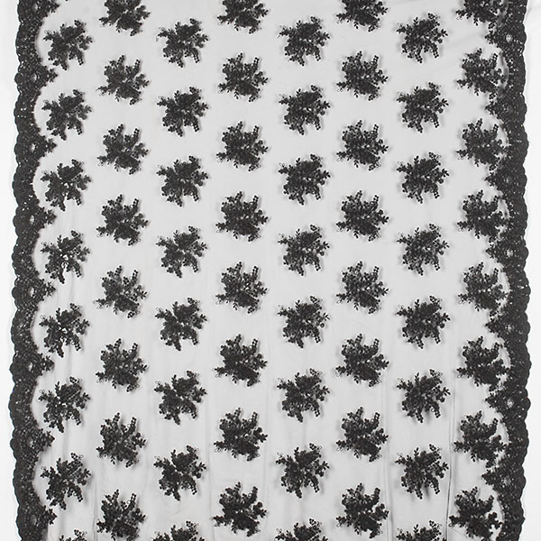 Krajka na hladkém tylu květy černévýšivka květů černé barvy na podkladovém hladém tylu černém barvy.Krajka na hladkém tylu květy černé je pružná svou vazbou, splývavá a průsvitná.