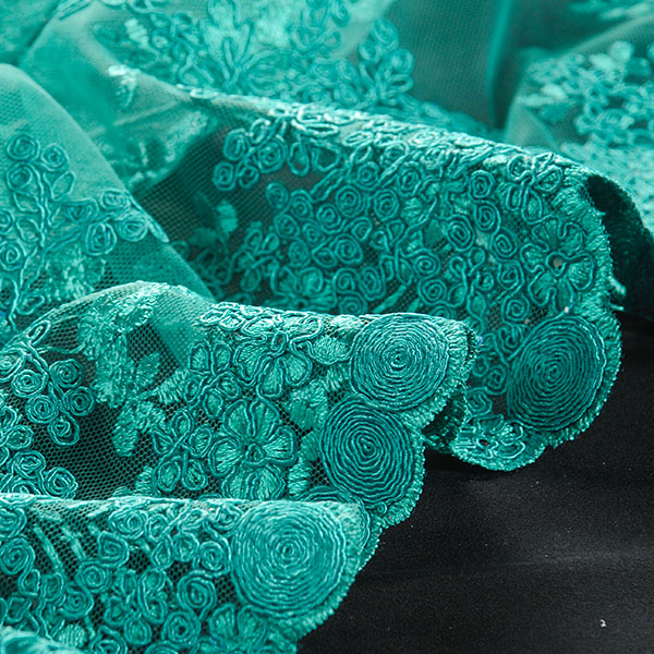Krajka na hladkém tylu květy smaragdově zelenávýšivka květů na hladkém tylu smaragdově zelená. Krajka na hladkém tylu květy smaragdově zelená je pružná svou vazbou, splývavá a průsvitná.