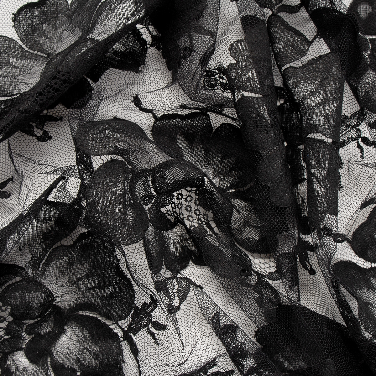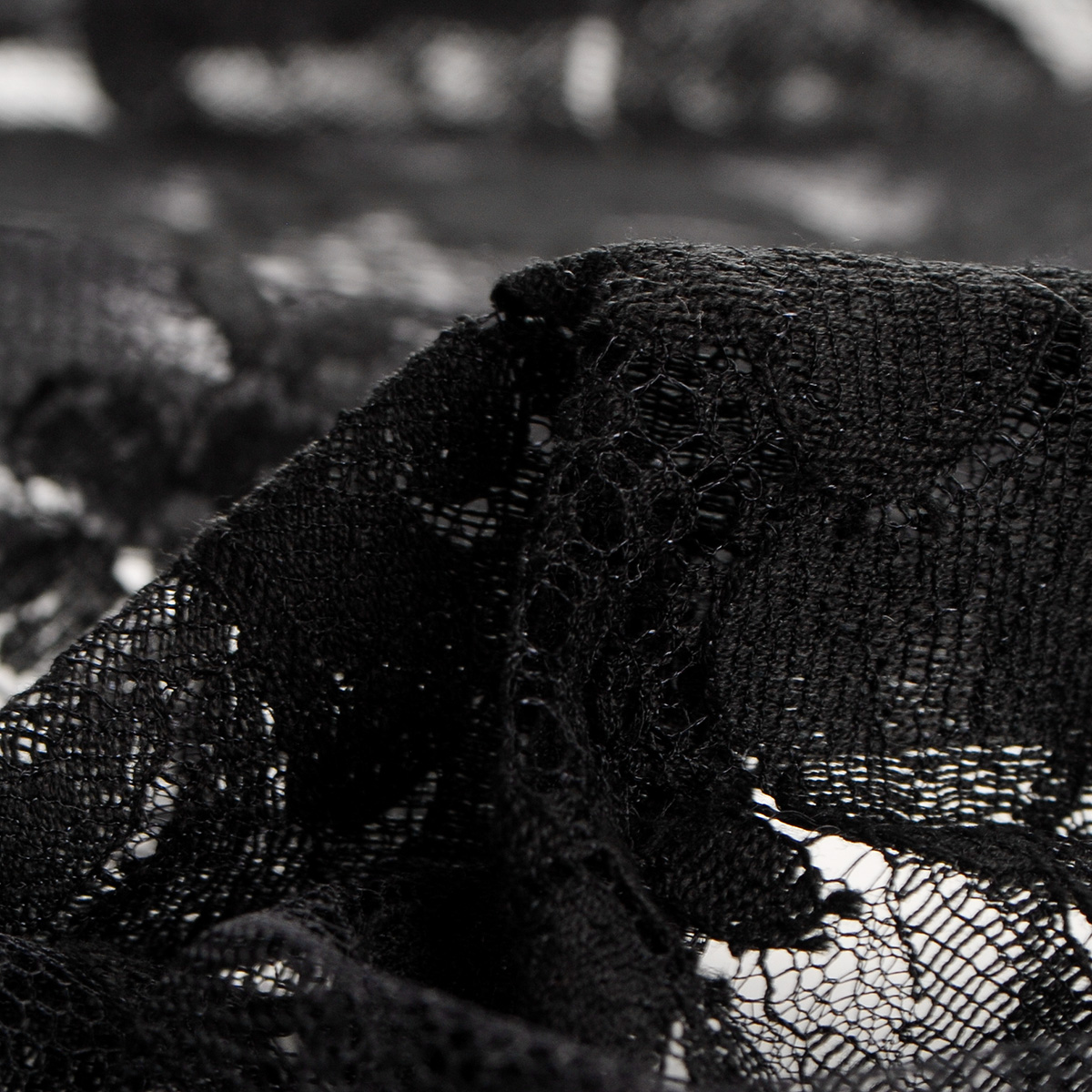 Jemná krajka se vzorem květů na hladkém tylu v černé barvě. Krajka je lehce pružná svou vazbou, je splývavá a průsvitná.