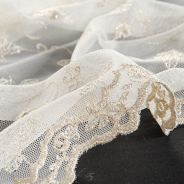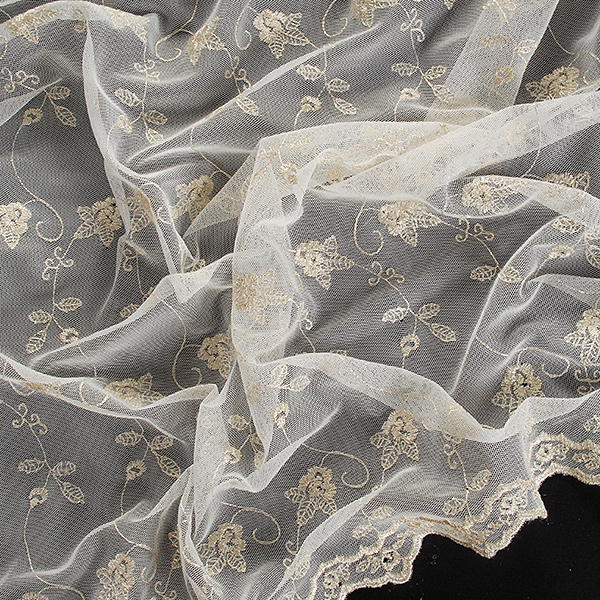 Krajka výšivka na tylu v barvě slonové kosti s lurexovou stříbrnou výšivkou a květinovým motivem. Podkladový tyl je v barvě slonové kosti. Metráž je pružná svou vazbou, splývavá a průsvitná.