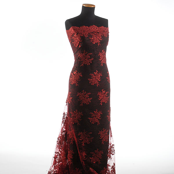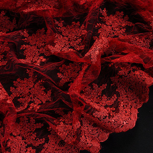 Krajka na vzorovém tylu výšivka ve vínové barvě s květinovým motivem na podkladovém tylu vínové barvy s krajkovým motivem. Krajka na vzorovém tylu je pružná svou vazbou, splývavá a průsvitná.